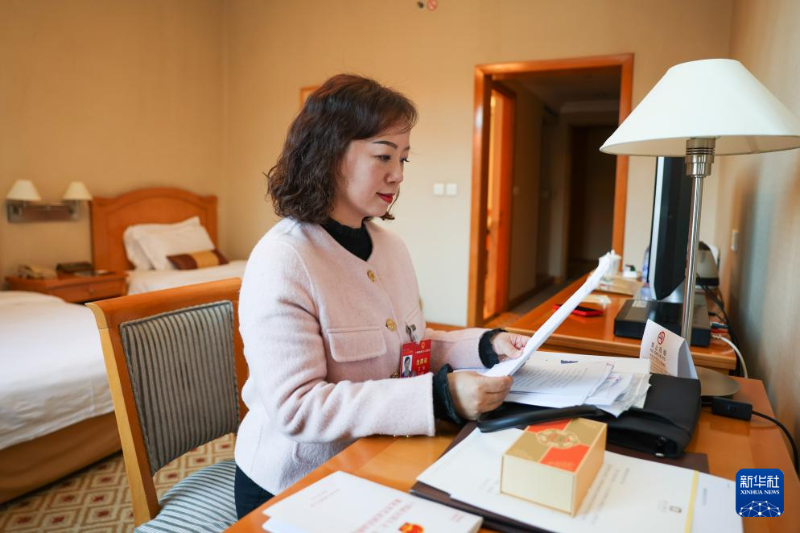 3月3日,王瓊代表在湖北代表團(tuán)駐地查看文件。