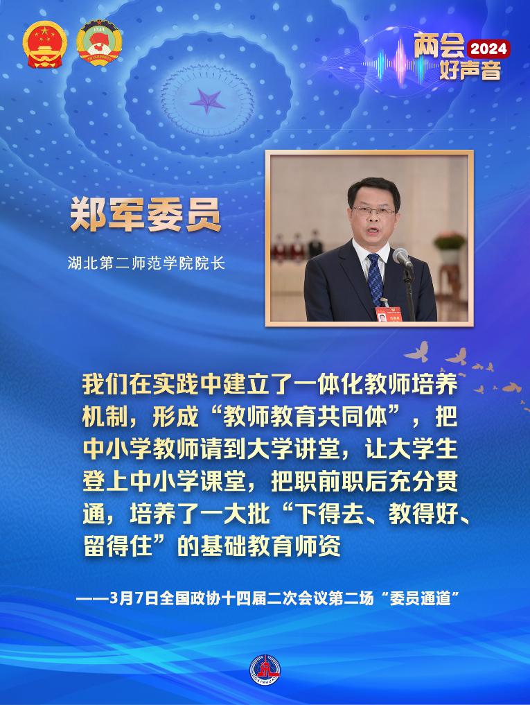 “我們?cè)趯?shí)踐中建立了一體化教師培養(yǎng)機(jī)制,形成‘教師教育共同體’,把中小學(xué)教師請(qǐng)到大學(xué)講堂,讓大學(xué)生登上中小學(xué)課堂,把職前職后充分貫通,培養(yǎng)了一大批‘下得去、教得好、留得住’的基礎(chǔ)教育師資?!焙钡诙煼秾W(xué)院院長(zhǎng)鄭軍委員說(shuō)。