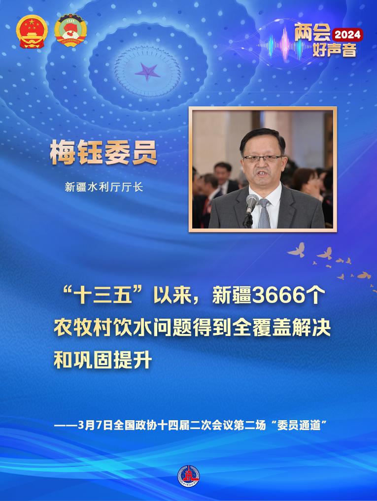 新疆是典型的內(nèi)陸干旱地區(qū),新疆水利廳廳長(zhǎng)梅鈺委員講述了新疆做好“水文章”的兩個(gè)小故事,帶來(lái)了新疆人民喝上“放心水”“幸福水”、新疆高效合理科學(xué)利用水資源的好消息。
