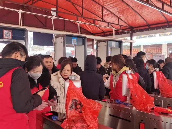 ▲ 春節(jié)游客高峰期,文旅志愿者在南岳大廟幫助查驗門票,縮短游客入園排隊時間。 衡陽市南岳區(qū)文化旅游廣電體育局供圖