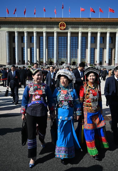 3月8日,參加完十四屆全國人大二次會(huì)議第二次全體會(huì)議的全國人大代表盧丹(左)、趙子銥(中)、付慶梅走出北京人民大會(huì)堂。