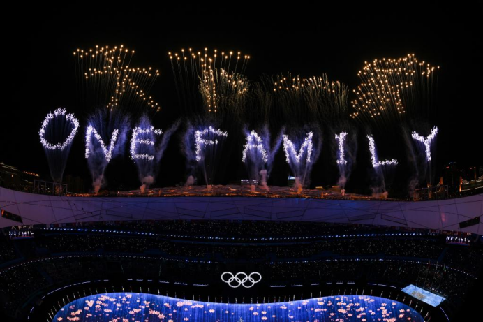 2月20日晚,北京第二十四屆冬季奧林匹克運(yùn)動會閉幕式在國家體育場舉行。這是焰火在“鳥巢”上空顯示出中文“天下一家”和英文“ONE FAMILY”字樣。(新華社記者 宋彥樺/攝)