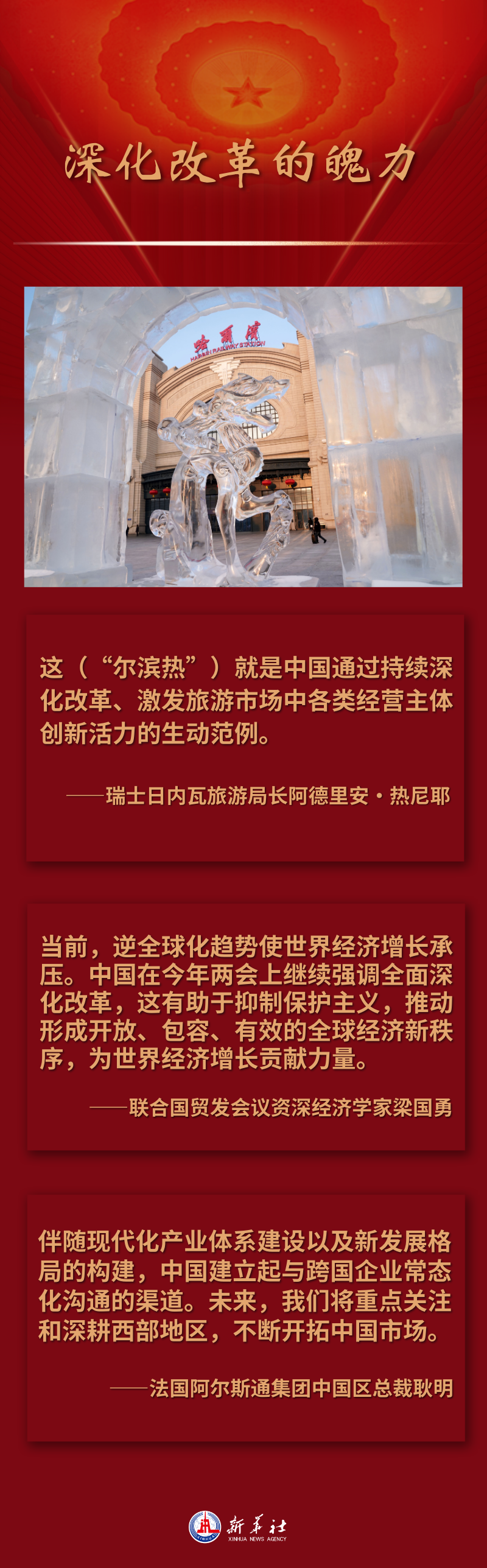 今年年初,“爾濱熱”火出國門,引來歐洲冰雪勝地瑞士旅游部門的“隔空互動”。瑞士日內(nèi)瓦旅游局長阿德里安·熱尼耶說,這就是中國通過持續(xù)深化改革、激發(fā)旅游市場中各類經(jīng)營主體創(chuàng)新活力的生動范例。“我很佩服哈爾濱,政府能與整個市場一同努力挖掘冰雪旅游資源、改革完善相關(guān)機制,讓冬季活動變得如此多彩!”