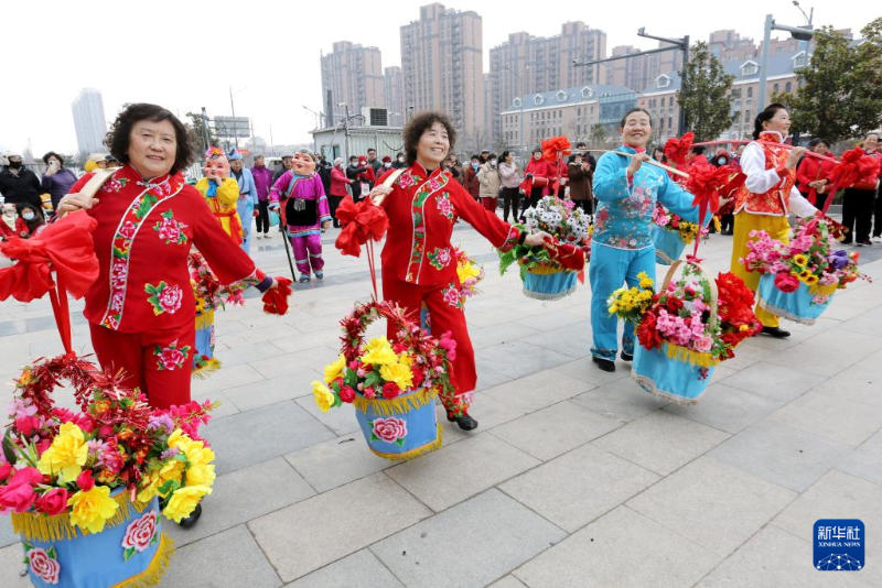 3月11日,民間藝人在江蘇省連云港市連云區(qū)云山街道廣場(chǎng)進(jìn)行挑花籃表演。