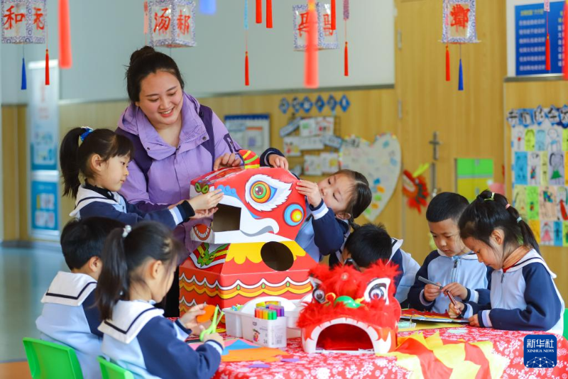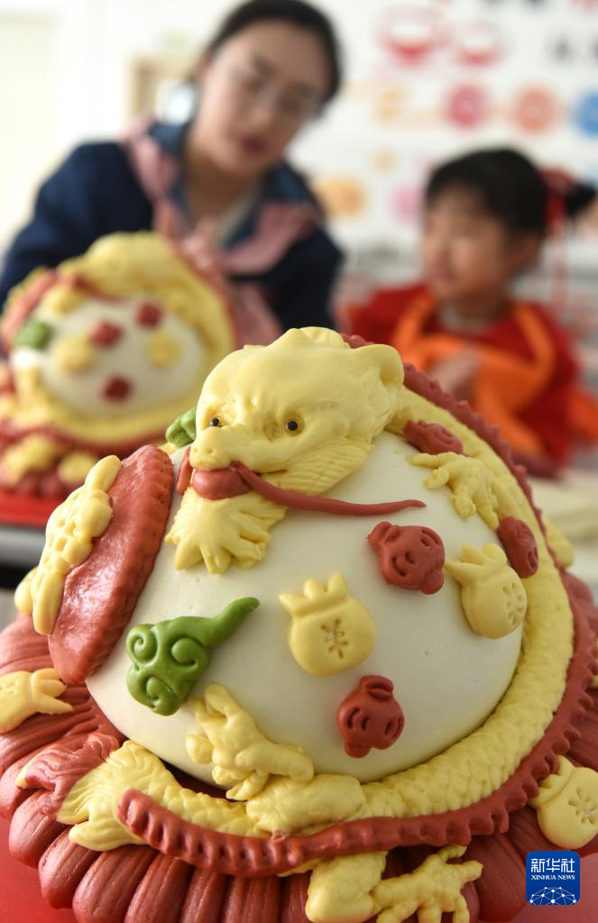 3月11日,在山東省淄博市沂源縣南麻街道西臺(tái)幼兒園,老師和小朋友一起制作面塑龍。