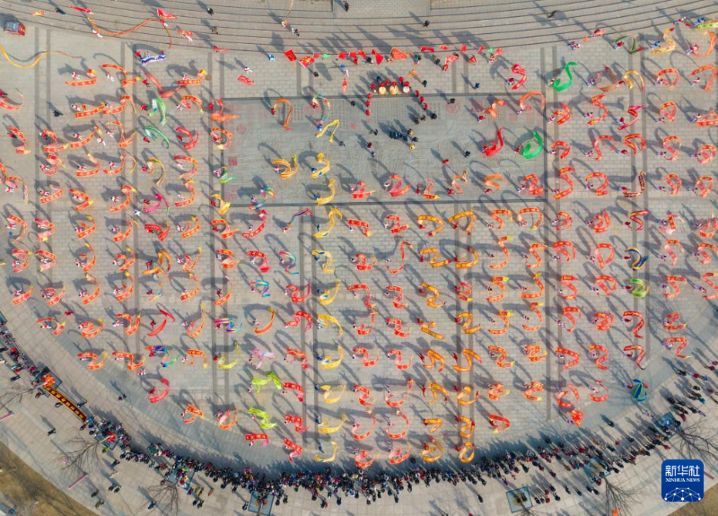 3月11日,在江蘇省淮安市洪澤區(qū)高良澗街道,民間藝人進(jìn)行舞龍表演(無人機(jī)照片)。