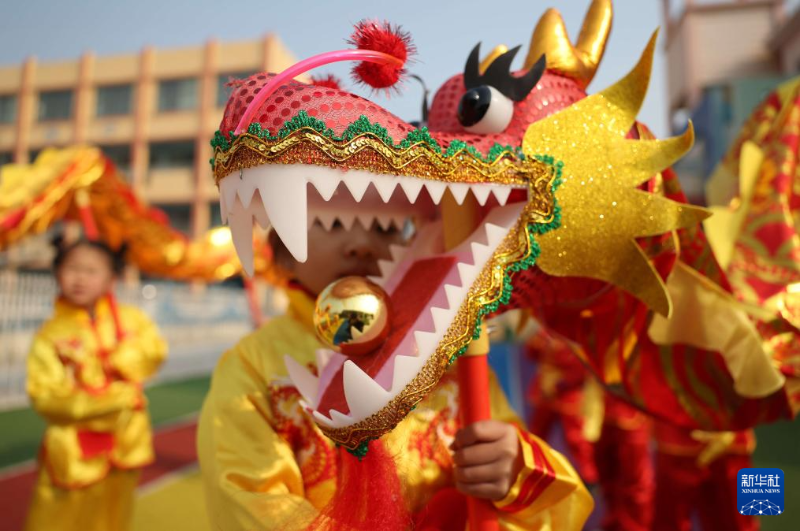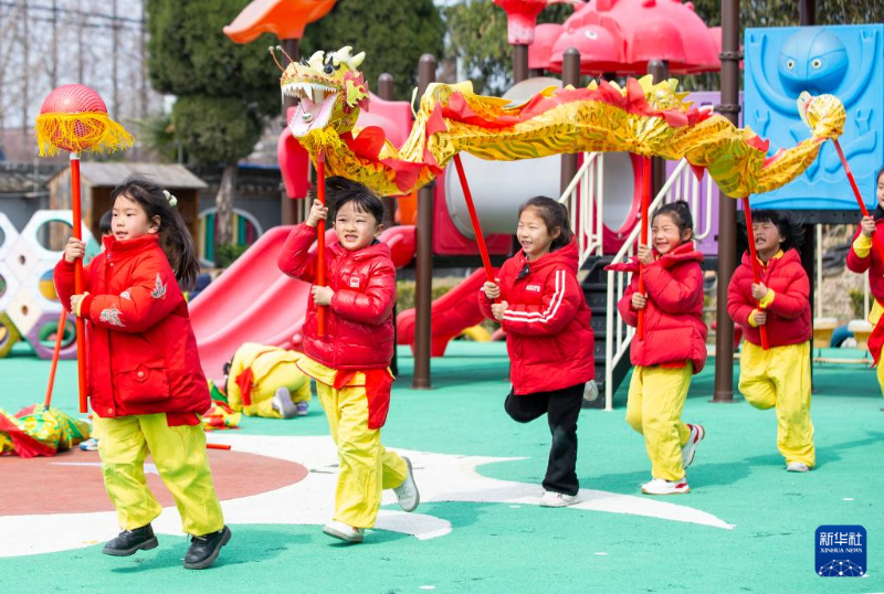 3月11日,山東省青島市即墨區(qū)龍山中心幼兒園的孩子們?cè)谶M(jìn)行舞龍表演。