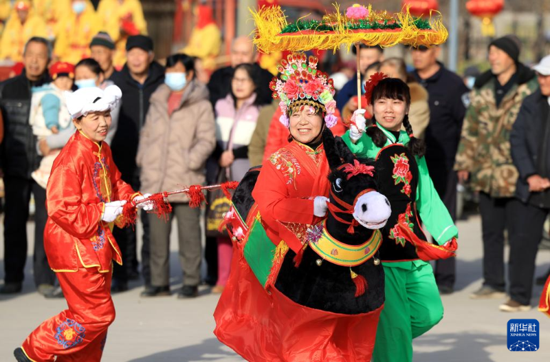 3月11日,人們?cè)诤颖笔∈仪f市新華區(qū)大郭鎮(zhèn)于底村文化廣場(chǎng)進(jìn)行民俗表演。