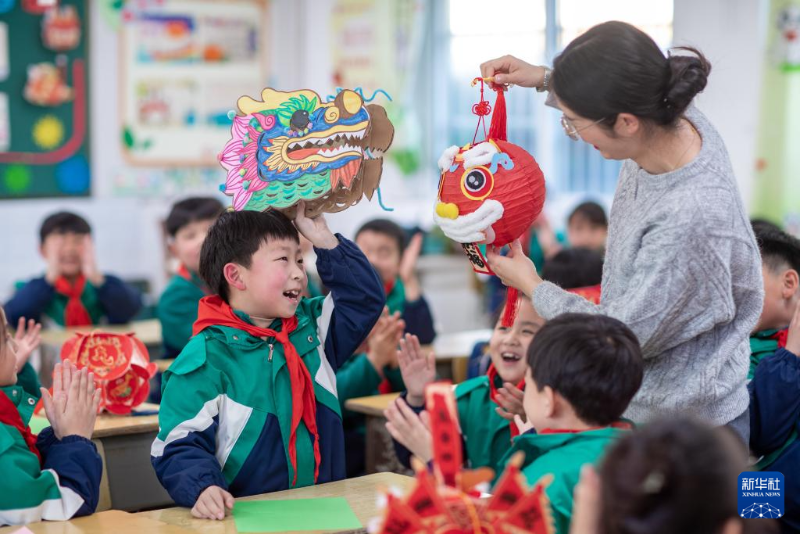 3月11日,在江蘇省興化市新生中心小學(xué),學(xué)生展示制作的“龍?zhí)ь^”主題手工作品。