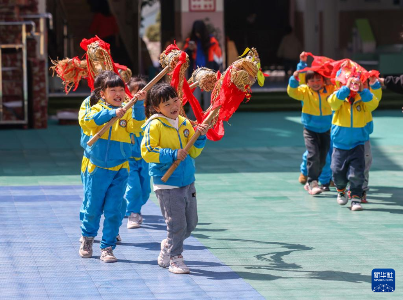 3月11日,貴州省銅仁市玉屏侗族自治縣實(shí)驗(yàn)幼兒園的小朋友在體驗(yàn)舞龍。