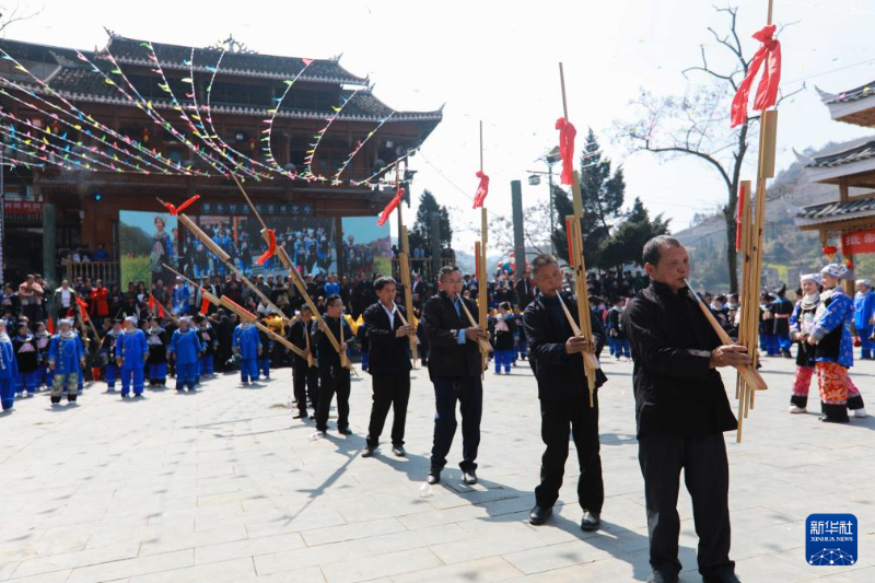 3月11日,在貴州省黔東南苗族侗族自治州三穗縣臺(tái)烈鎮(zhèn)寨頭村,人們吹奏蘆笙祈福來年風(fēng)調(diào)雨順。