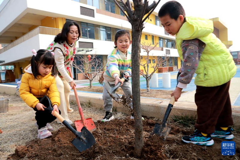 3月11日,在山東省高密市鳳鳴實驗幼兒園,孩子們和老師一起在校園里栽種樹木。
