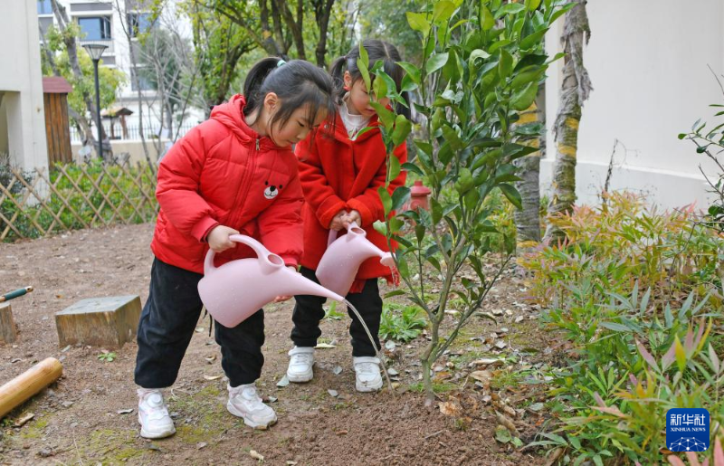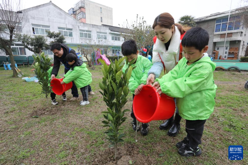 3月11日,浙江省臺州市仙居縣中心幼兒園的孩子們給樹苗澆水。