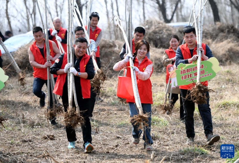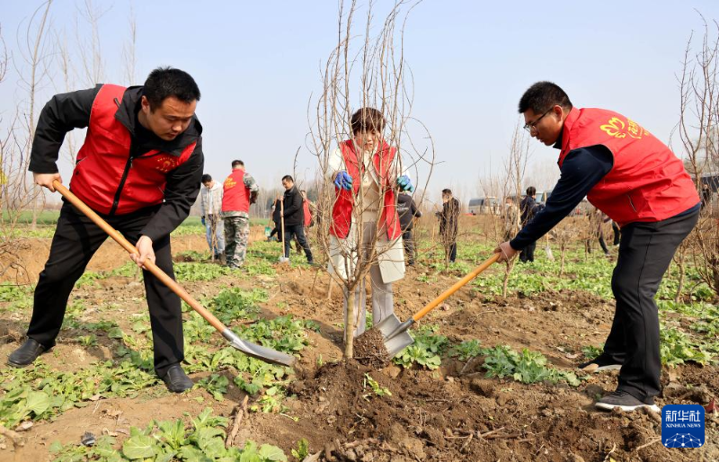3月11日,在山東省棗莊市西王莊鎮(zhèn)西花溝村,志愿者在栽植石榴樹。