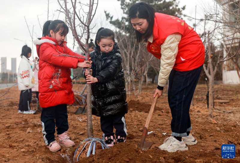 3月11日,江蘇省蘇州市姑蘇區(qū)新莊社區(qū)志愿者帶著小朋友一起參加義務(wù)植樹活動。