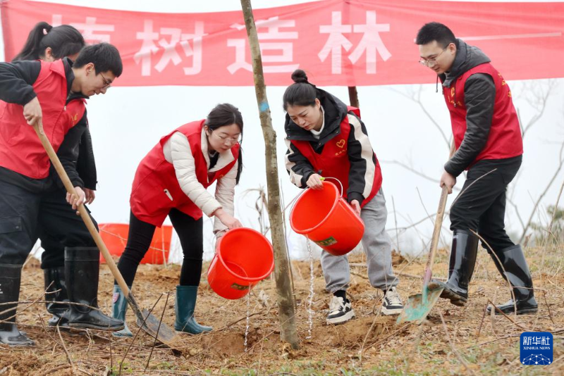 3月11日,在浙江省湖州市德清縣阜溪街道龍勝村,青年志愿者給剛栽種的樹苗澆水。