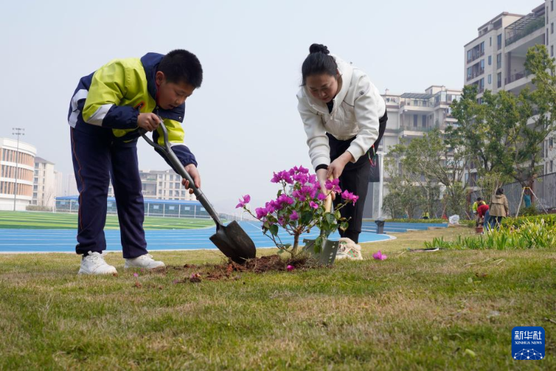 3月11日,在重慶市北碚區(qū)兩江春暉小學(xué),家長帶著孩子在校園種植三角梅。