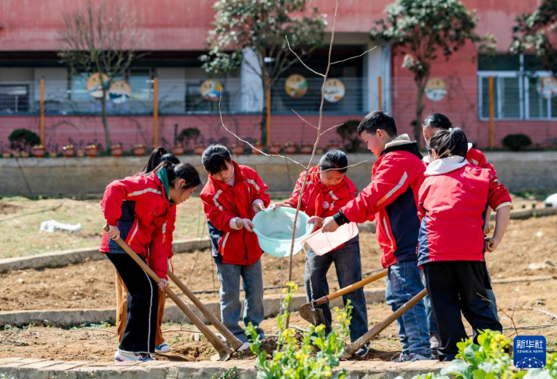 3月11日,學(xué)生在貴州省黔西市惠風(fēng)學(xué)校勞動基地植樹。