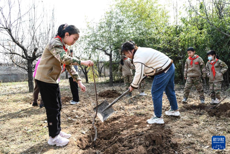 3月11日,在河南省濟源市坡頭鎮(zhèn)第三小學(xué),學(xué)生與老師一起栽植小樹苗。