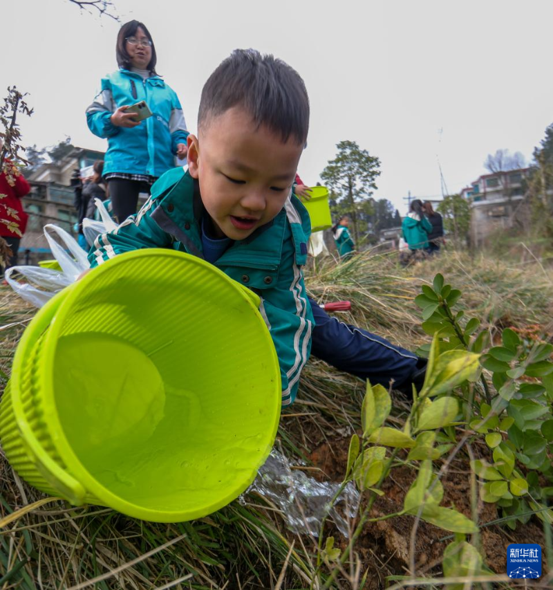 3月11日,在貴州省開陽縣硒城街道,幼兒園的小朋友給種下的樹苗澆水。