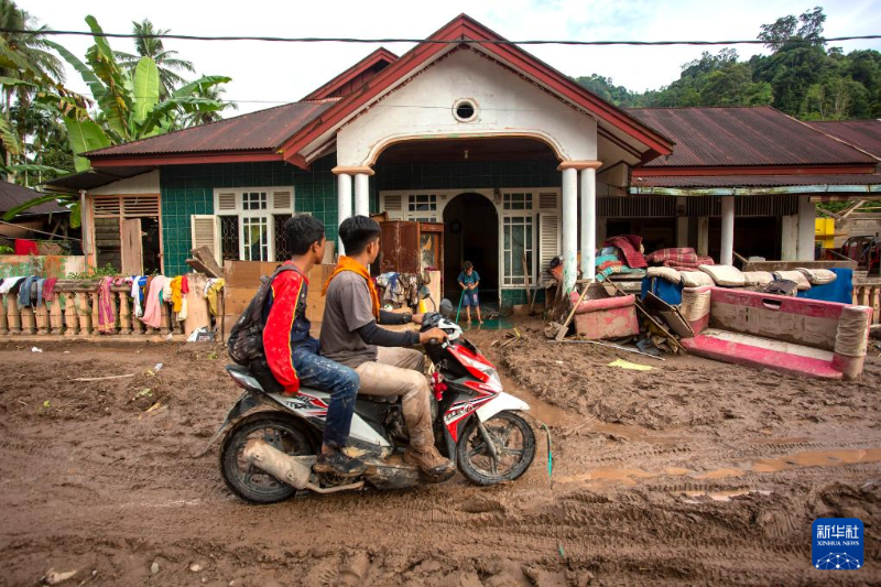 3月10日,在印度尼西亞西蘇門答臘省南佩西西爾,人們騎車經(jīng)過暴雨過后的房屋。