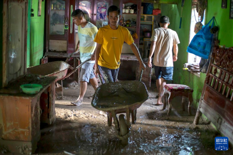 3月10日,在印度尼西亞西蘇門答臘省南佩西西爾,人們打掃暴雨過后的房屋。