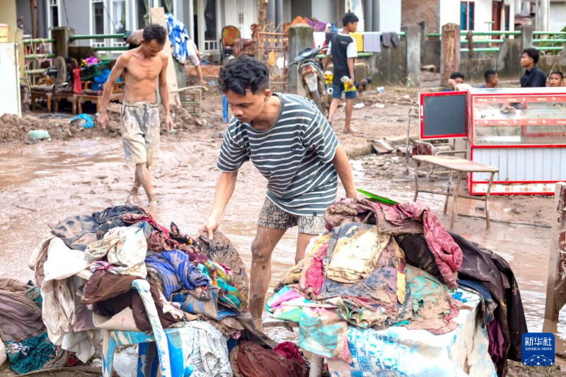 3月10日,在印度尼西亞西蘇門答臘省南佩西西爾,一名男子在暴雨過后整理個(gè)人物品。
