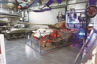 在這座博物館內(nèi),陳列著一輛“黑豹”A中型坦克(上圖)。這輛坦克的半截車身被炸得面目全非,內(nèi)部燃燒的“火焰”有一種觸目驚心的效果。