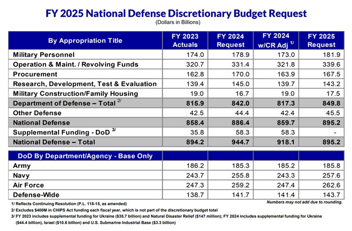據(jù)透露,2025財(cái)年國(guó)防部預(yù)算申請(qǐng)包括1432億美元的研發(fā)、測(cè)試和評(píng)估(RDT&E)經(jīng)費(fèi),其中科技投資172億美元;人工智能投資18億美元。軍備采購(gòu)預(yù)算為1675億美元。盡管軍費(fèi)連年攀升,但由于2023年國(guó)會(huì)達(dá)成的預(yù)算案安排,每年開支增幅限制于1%,2025財(cái)年五角大樓提出的預(yù)算申請(qǐng)?jiān)龇^小,美國(guó)防界開始嚷嚷錢不夠用,武器采購(gòu)不如預(yù)期,太空軍投入減少等。