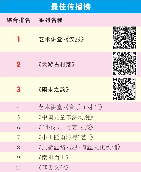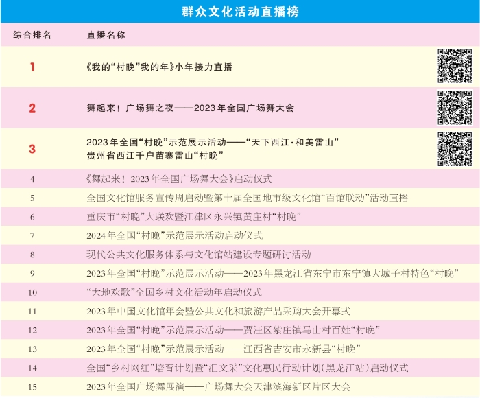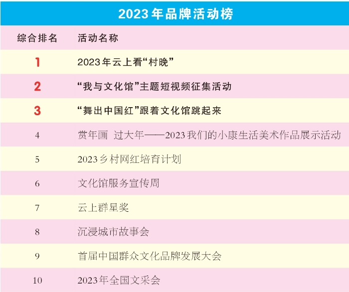 此次榜單重點(diǎn)推介了有創(chuàng)意、有成效、有特色的公共文化服務(wù)典型,共設(shè)置了品牌活動(dòng)榜、最佳傳播榜、群眾文化活動(dòng)直播榜、最具活力地區(qū)榜、學(xué)才藝名師榜、青少年美育課程榜以及2023鄉(xiāng)村網(wǎng)紅榜等7個(gè)排行榜單,涵蓋省、市、縣三級(jí)文化服務(wù)機(jī)構(gòu),以及看直播、享活動(dòng)、學(xué)才藝、訂場(chǎng)館等多個(gè)服務(wù)領(lǐng)域。榜單也將在國(guó)家公共文化云平臺(tái)、微信公眾號(hào)、微博、央視頻、今日頭條、抖音、快手等相關(guān)國(guó)家公共文化云新媒體宣傳矩陣中進(jìn)行同步刊發(fā)。