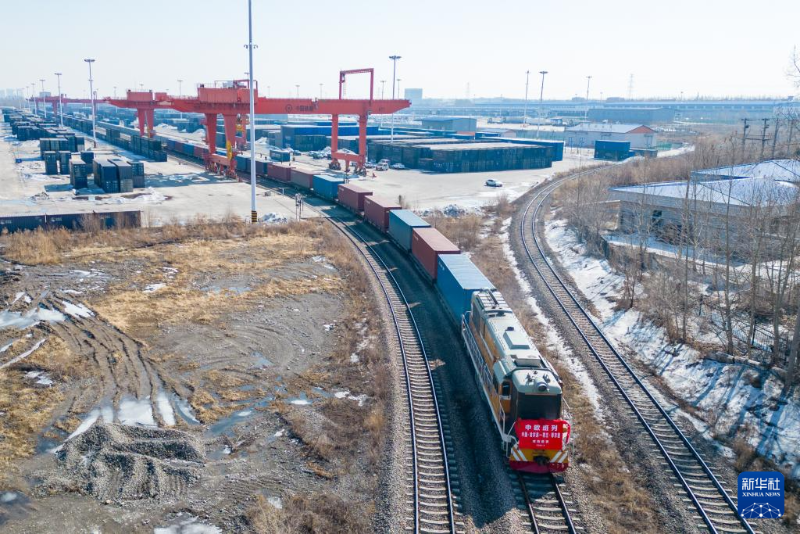 3月14日,中歐班列(哈爾濱——蒂爾堡)準備從哈爾濱國際集裝箱中心站出發(fā)(無人機照片)。