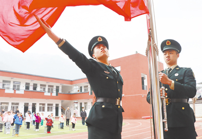 2月下旬,火箭軍某旅官兵走進(jìn)駐地共建小學(xué)開(kāi)展國(guó)防教育活動(dòng),培養(yǎng)學(xué)生們的愛(ài)國(guó)情懷和國(guó)防意識(shí)。圖為官兵與學(xué)校師生共同舉行升國(guó)旗儀式。