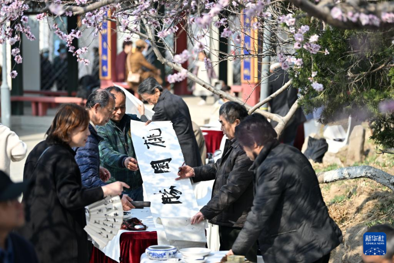 3月15日,游人在天津桃花堤欣賞書法作品。