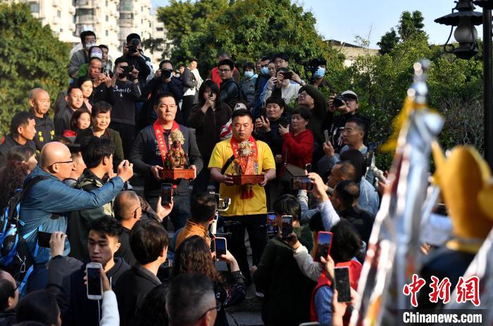 中新社福州3月19日電(記者 閆旭)19日,臺灣青年陳玄豐、陳奕榕捧著媽祖、廣澤尊王的神像,走過福州臺江區(qū)新橋仔河上的三通橋。當日,第三屆兩岸青年信俗淵源尋根之旅拉開序幕。