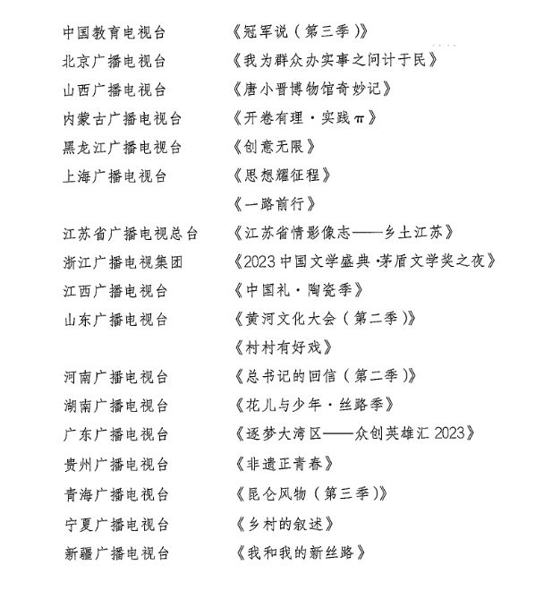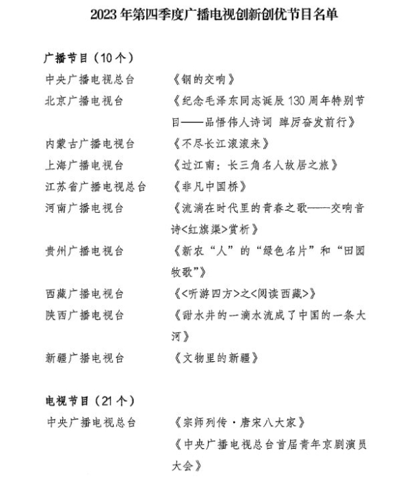 中新網(wǎng)3月21日電 據(jù)國家廣播電視總局網(wǎng)站消息,國家廣播電視總局辦公廳發(fā)布關于公布2023年第四季度廣播電視創(chuàng)新創(chuàng)優(yōu)節(jié)目的通知。近日,經(jīng)廣電總局組織評選,確定中央廣播電視總臺《鋼的交響》、內蒙古廣播電視臺《不盡長江滾滾來》等10個廣播節(jié)目,中央廣播電視總臺《宗師列傳·唐宋八大家》、上海廣播電視臺《思想耀征程》等21個電視節(jié)目為“2023年第四季度廣播電視創(chuàng)新創(chuàng)優(yōu)節(jié)目”。