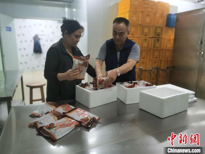 3月22日,張忠義和葉秋紅在打包香腸。記者 蔣雪林 攝