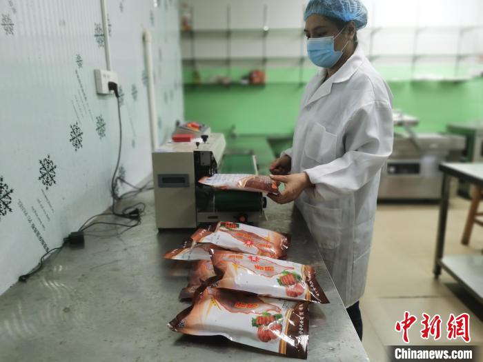 3月22日,葉秋紅在給香腸包裝。記者 蔣雪林 攝