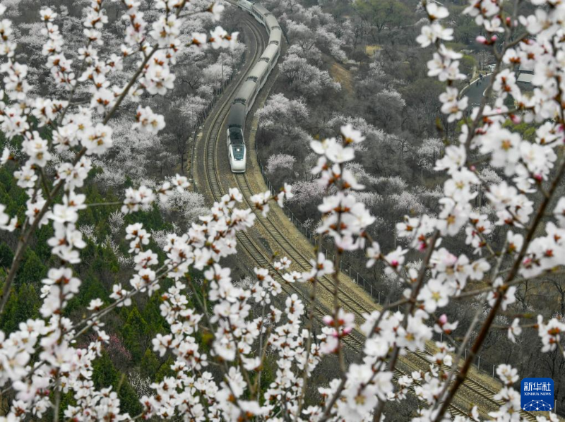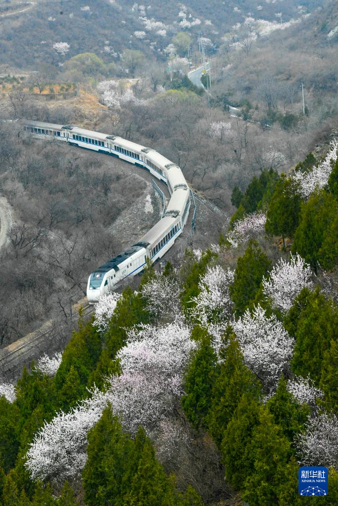 3月24日,一列客運列車行駛在北京市居庸關(guān)長城腳下的花海中。