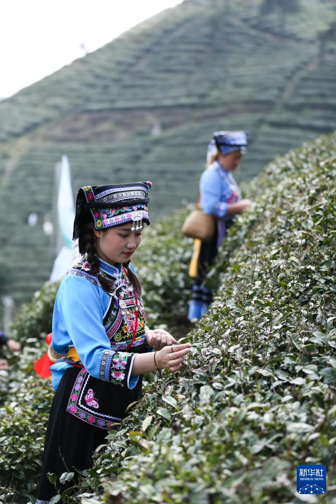 3月24日,村民在貴州省黔西南布依族苗族自治州興義市七舍鎮(zhèn)革上村的茶園里采摘春茶。