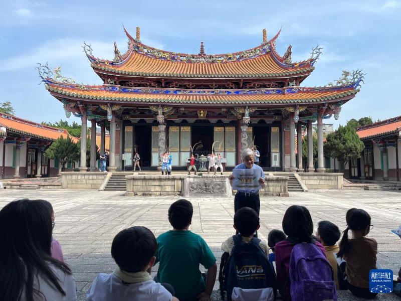 3月23日,臺(tái)灣傳統(tǒng)建筑研究專家李乾朗向小朋友們展示臺(tái)北孔廟手繪圖紙。