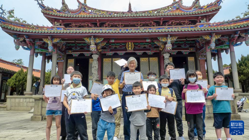 3月23日,課程結(jié)束后,臺(tái)灣傳統(tǒng)建筑研究專家李乾朗和小朋友們?cè)诖蟪傻钋昂嫌傲裟睢?/p>