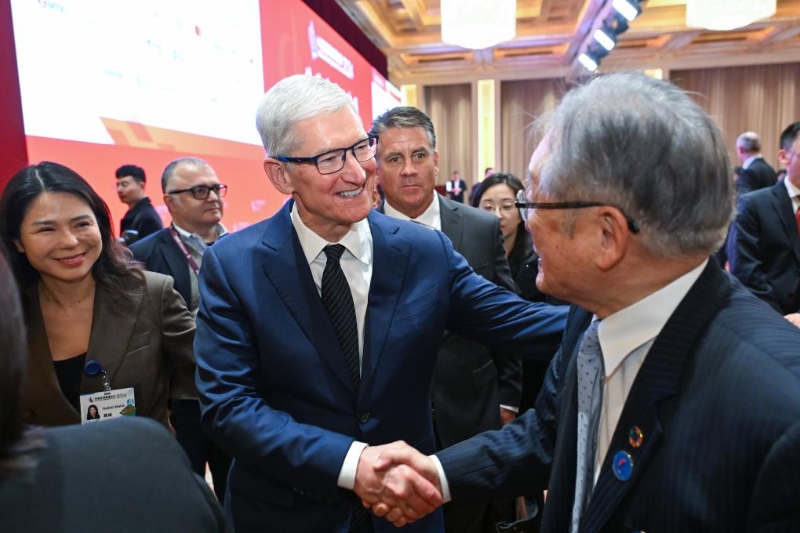3月24日,蘋果公司首席執(zhí)行官蒂姆·庫克(中)在中國發(fā)展高層論壇2024年年會會場與嘉賓交流。新華社記者 李鑫 攝