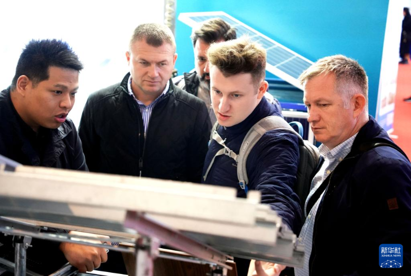 3月26日,幾名外國參觀者在一家國內氫能源企業(yè)展臺前與參展商交流。