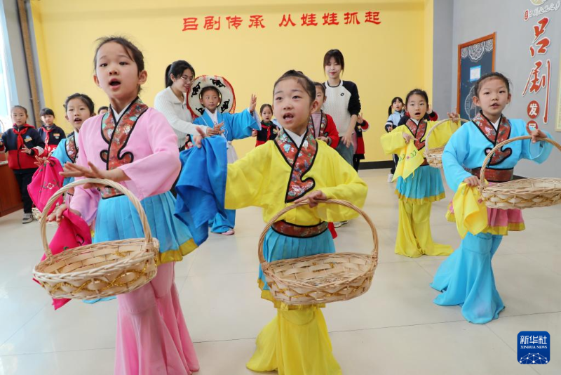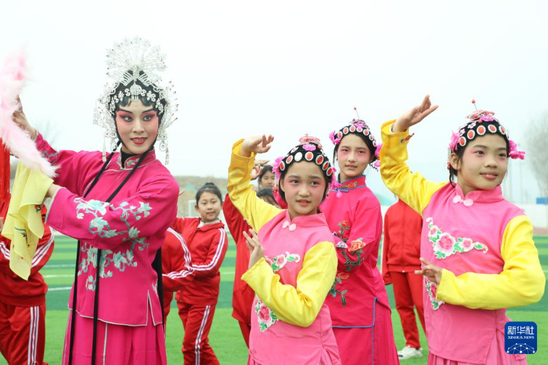 3月26日,在河北省石家莊市欒城區(qū)三蘇小學(xué),石家莊市欒城區(qū)絲弦劇團(tuán)的演員指導(dǎo)學(xué)生學(xué)習(xí)唱腔和表演技巧。