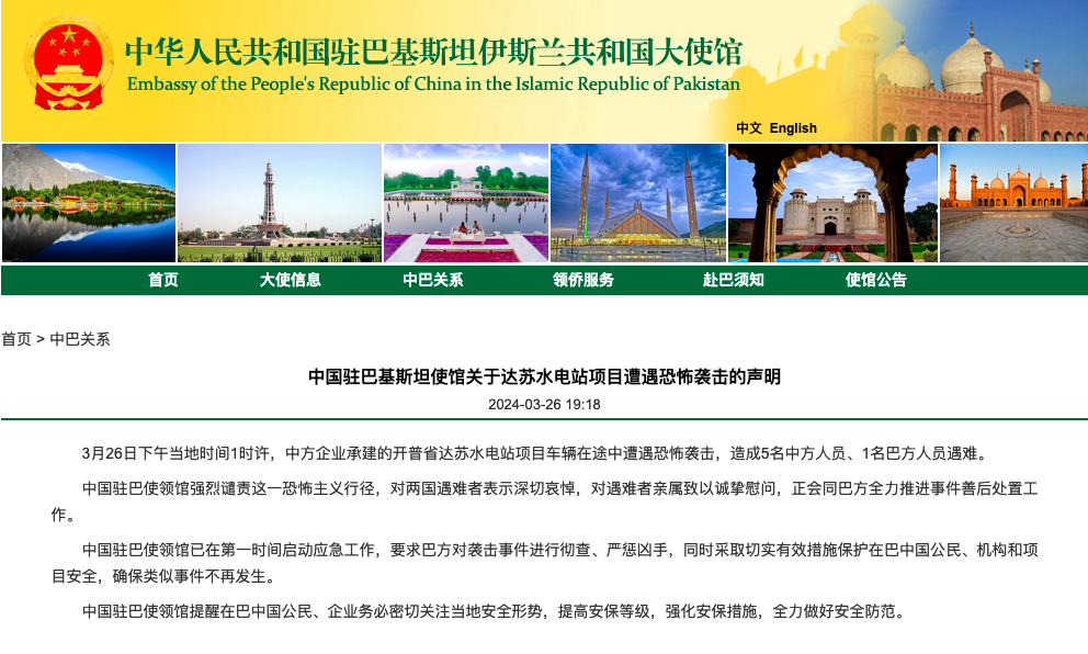 中國(guó)駐巴基斯坦使館關(guān)于達(dá)蘇水電站項(xiàng)目遭遇恐怖襲擊的聲明。(圖源:中國(guó)駐巴基斯坦大使館網(wǎng)站)
