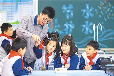 3月21日,在山東省青島弘德小學(xué),污水處理廠講解員指導(dǎo)學(xué)生做實(shí)驗(yàn),培養(yǎng)孩子們愛水節(jié)水護(hù)水的環(huán)保意識(shí)。張 鷹攝(新華社發(fā))