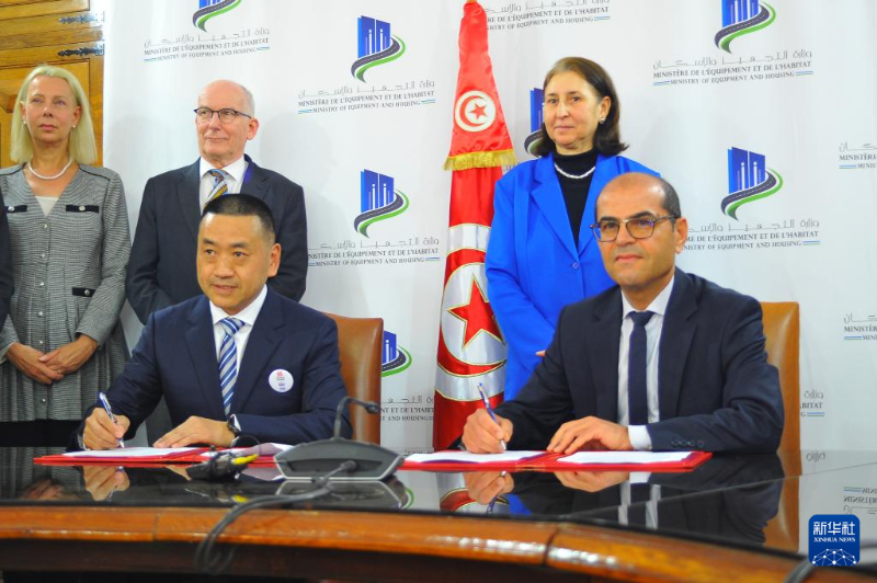 3月26日,四川公路橋梁建設集團有限公司董事長張航川(前左)與突尼斯裝備和住房部代表(前右)在突尼斯首都突尼斯市出席比塞大大橋項目簽約儀式。