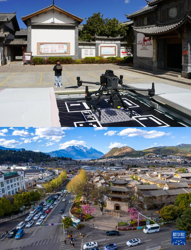 這張拼版照片的上圖為工作人員通過(guò)電腦操作無(wú)人機(jī)準(zhǔn)備在麗江古城內(nèi)進(jìn)行巡視(3月23日攝);下圖為無(wú)人機(jī)視角下拍攝的麗江古城一景(3月23日攝)。