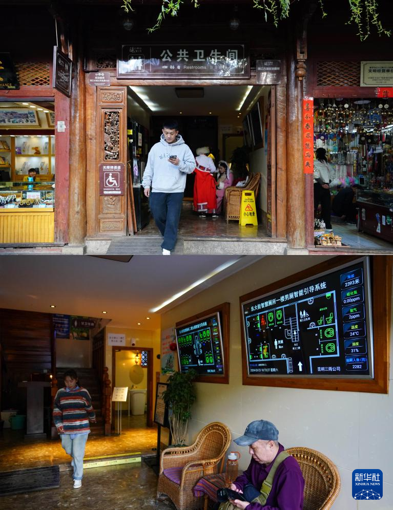 這張拼版照片的上圖為在麗江古城內(nèi)拍攝的智慧廁所外景(3月23日攝);下圖為智慧廁所內(nèi)的智能引導(dǎo)系統(tǒng)大屏(3月23日攝)。