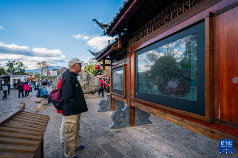 游客在麗江古城內(nèi)查看電子導(dǎo)覽大屏(3月23日攝)。